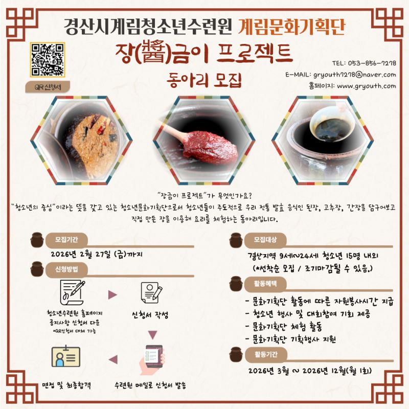 | 제목 | 2026년도 경산시계림청소년수련원 계림문화기획단 ‘장(醬)금이 프로젝트’ 동아리 모집 | ||||